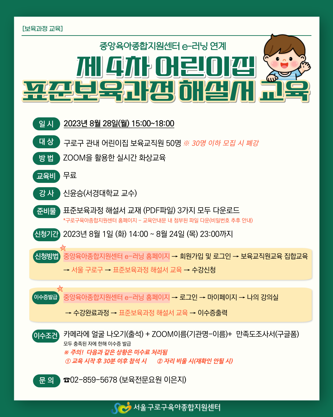 교육신청 및 이수증 출력 모두 중앙육아종합지원센터 e-러닝에서 진행해주세요!