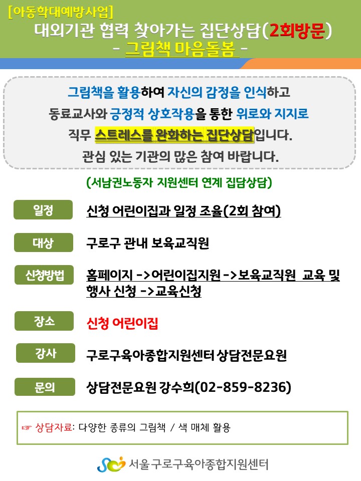 | [아동학대예방사업] 대외기관 협력 찾아가는 집단상담 - 그림책 마음돌봄 (2회 방문-신청어린이집과 일정 조정) |