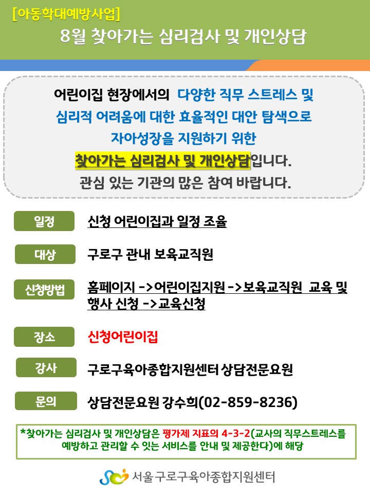 [아동학대예방사업] 8월 찾아가는 심리검사 및 개인상담
