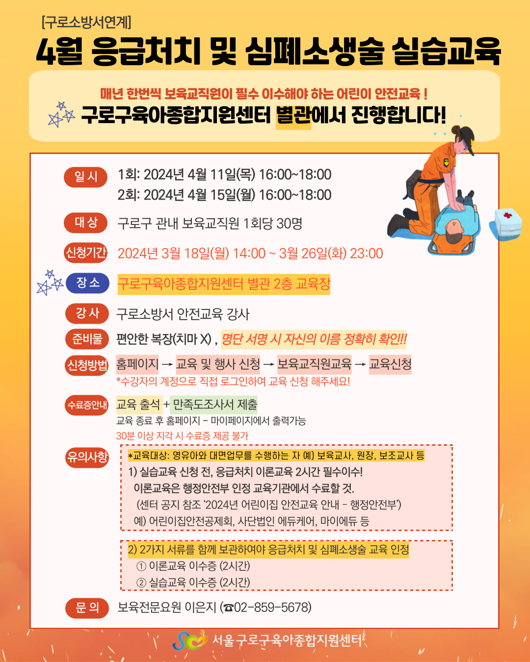 [취소] 4월 15일 응급처치 및 심폐소생술 실습교육(소방서연계)