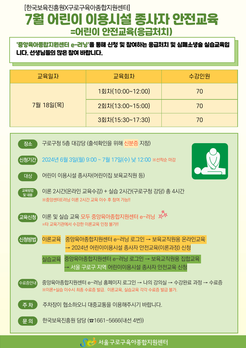 | 7월 어린이 이용시설 종사자 안전교육(응급처치 실습) ★중앙센터E러닝신청 |