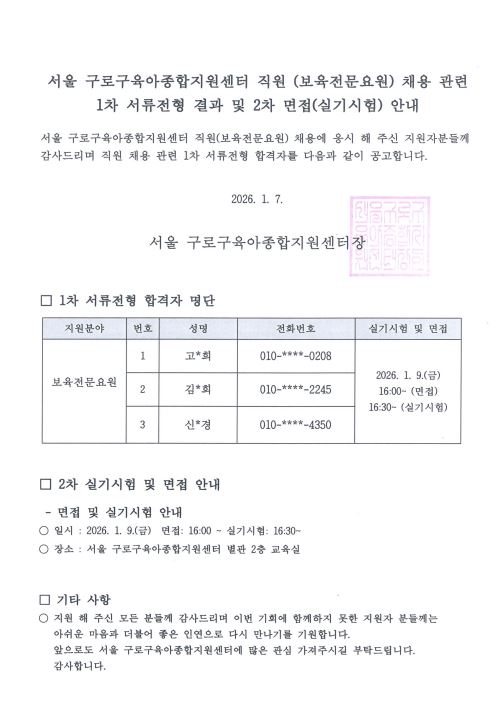 [GUROSCC-채용] 서울 구로구육아종합지원센터 직원 (보육전문요원) 채용 관련 1차 서류전형 결과 및 2차 면접 (실기시험) 안내