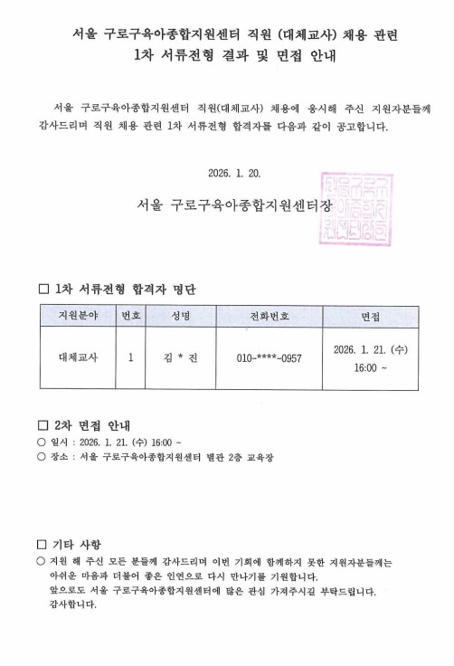 [GUROSCC- 채용] 2026년 서울 구로구육아종합지원센터 직원 (대체교사) 채용 관련 1차 서류전형 결과 및 면접 안내