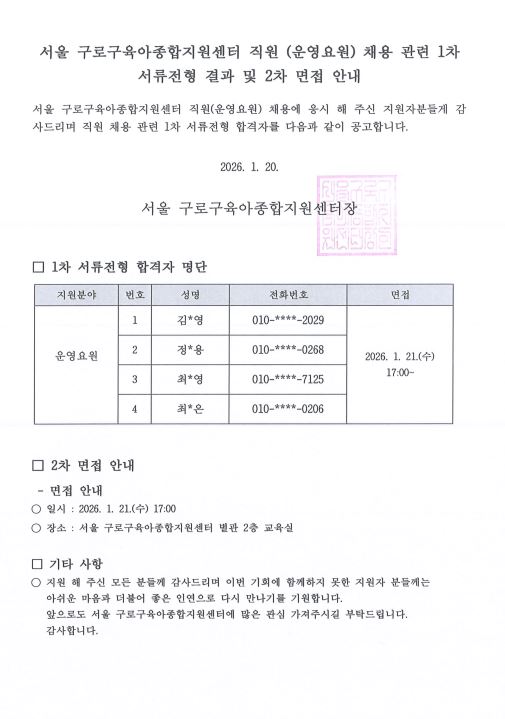 [GUROSCC- 채용] 2026년 서울 구로구육아종합지원센터 직원 (대체교사) 채용 관련 1차 서류전형 결과 및 면접 안내