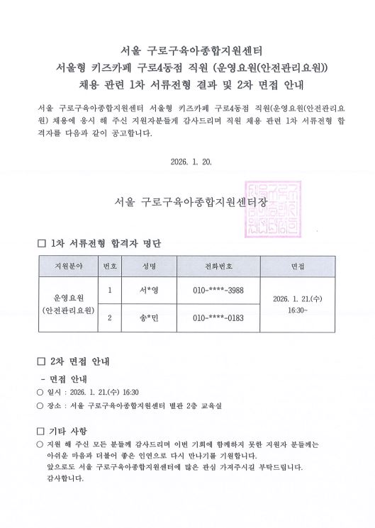 [GUROSCC-채용] 서울 구로구육아종합지원센터 직원(운영요원) 채용 관련 1차 서류전형 결과 및 2차 면접 안내