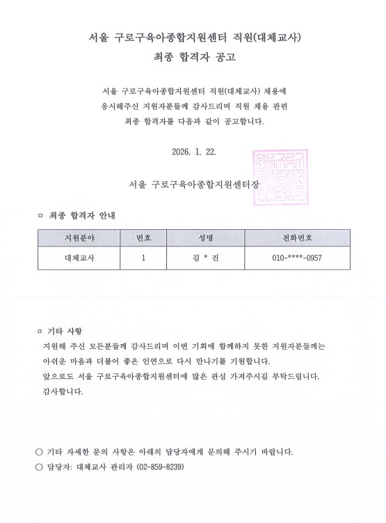 [GUROSCC-채용] 2026년 서울 구로구육아종합지원센터 직원(대체교사) 채용 최종 합격자 발표