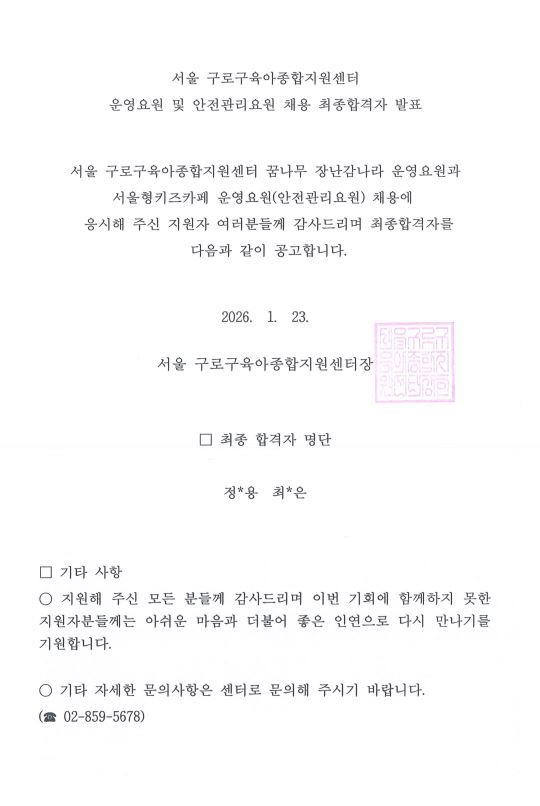 [GUROSCC-채용] 서울 구로구육아종합지원센터 꿈나무 장난감 나라 및 서울형키즈카페 구로4동점 직원 (운영요원 ,안전관리요원) 최종 합격자 발표 안내