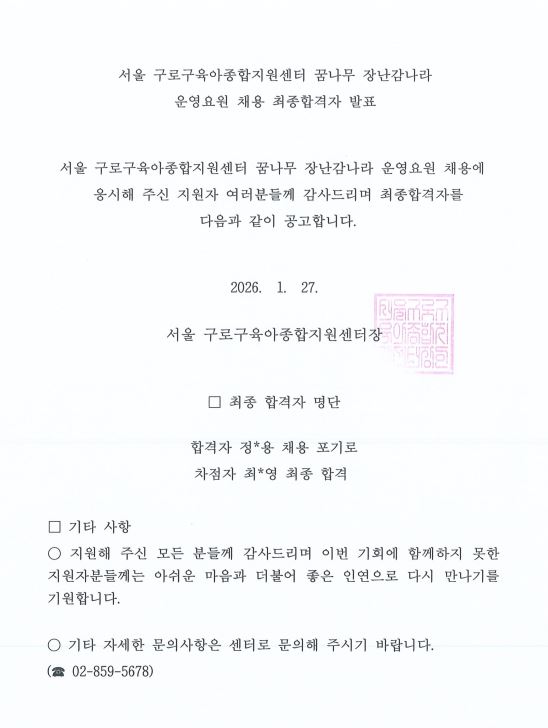 [GUROSCC-채용] 서울 구로구육아종합지원센터 꿈나무 장난감나라 운영요원 채용 최종 합격자 재발표 안내