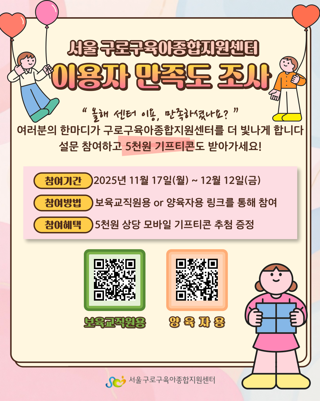 양육자용 센터 이용자 만족도 조사 링크: https://forms.gle/raf2JoisLP8V3bSVA