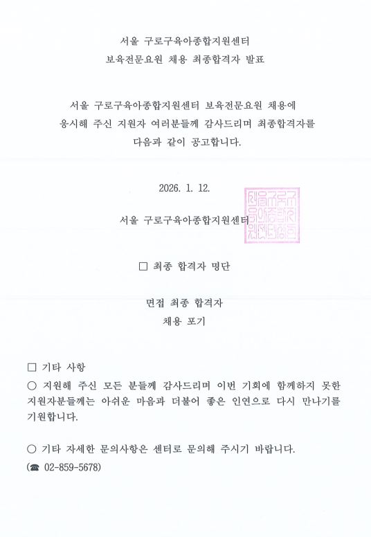 [GUROSCC-채용] 서울 구로구육아종합지원센터 직원(보육전문요원) 채용 최종합격자 발표 안내