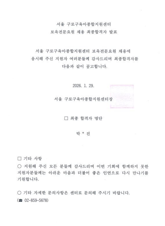 [GUROSCC-채용] 서울 구로구육아종합지원센터 직원(보육전문요원) 채용 최종합격자 발표 안내