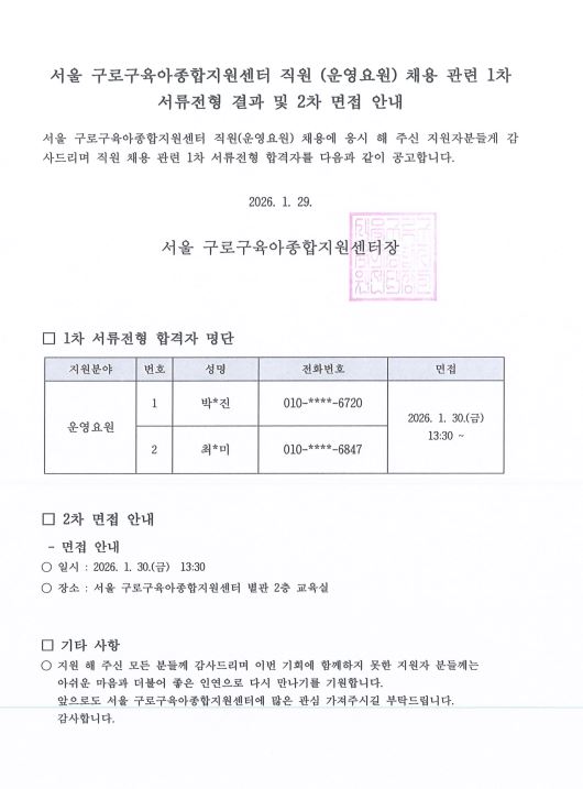 [GUROSCC-채용] 서울 구로구육아종합지원센터 직원 (운영요원) 채용 관련 1차 서류전형 결과 및 2차 면접 안내