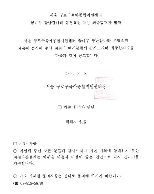 [GUROSCC-채용] 서울 구로구육아종합지원센터 직원(운영요원) 채용 최종합격자 발표 안내