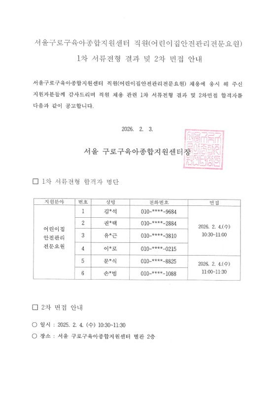 [GUROSCC-채용] 서울 구로구육아종합지원센터 직원 (어린이집안전관리전문요원) 채용 관련 1차 서류전형 결과 및 2차 면접 안내