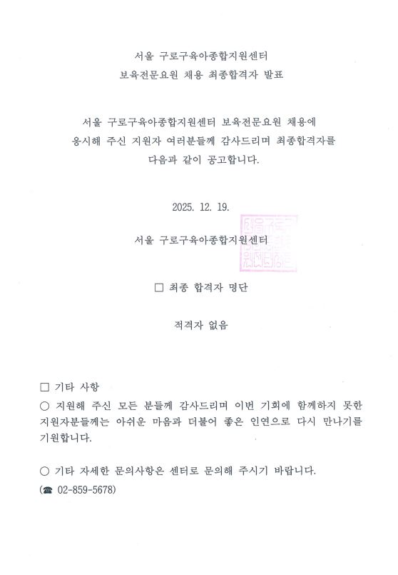 [GUROSCC-채용] 서울 구로구육아종합지원센터 직원(보육전문요원) 채용 최종합격자 안내