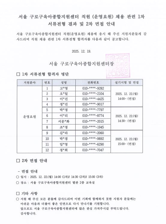 [GUROSCC- 채용] 서울 구로구육아종합지원센터 직원(운영요원) 채용 관련 1차 서류전형 결과 및 2차 면접 안내