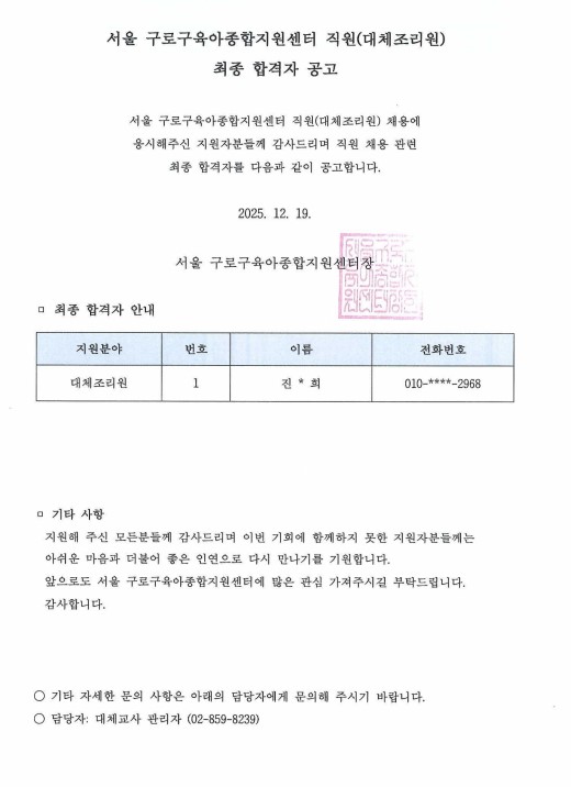 [GUROSCC-채용] 2025년 서울 구로구육아종합지원센터 직원(대체조리원) 채용 최종 합격자 발표