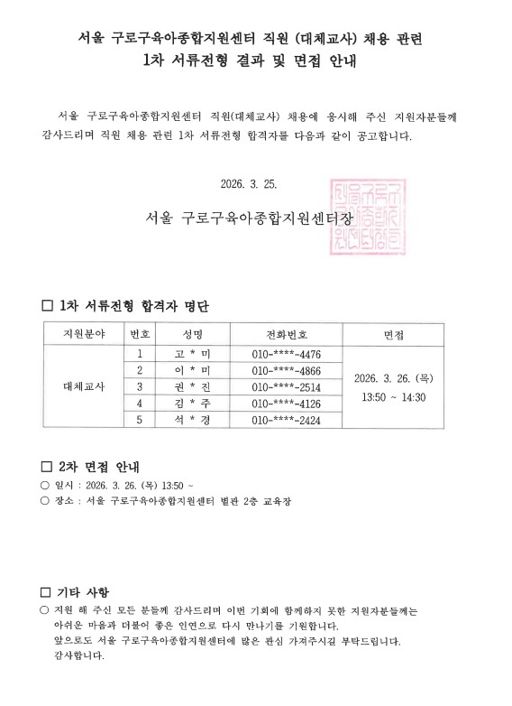 [GUROSCC-채용]서울 구로구육아종합지원센터 직원 (대체교사) 채용 관련 1차 서류전형 결과 및 면접 안내