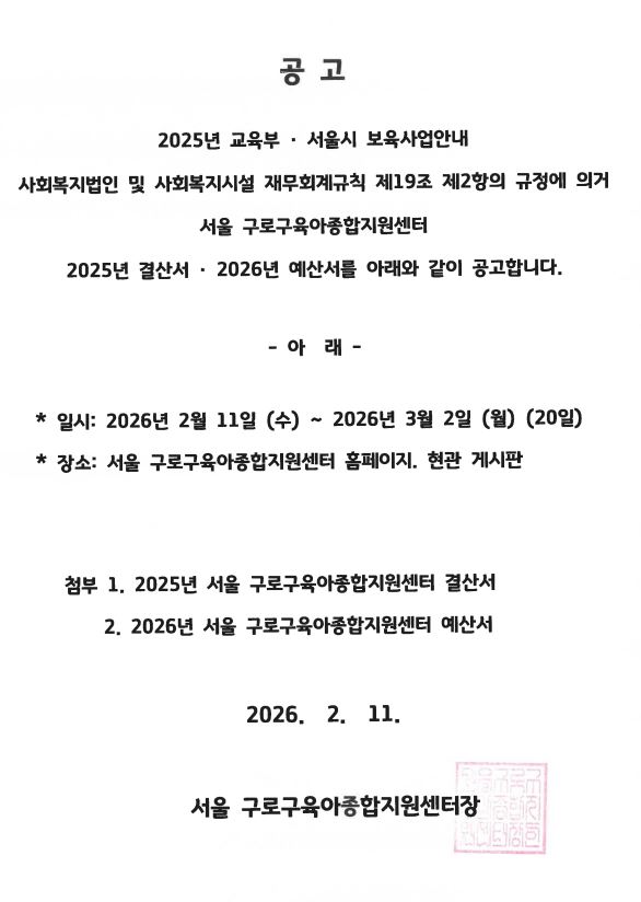 [GUROSCC-공고] 서울 구로구육아종합지원센터 2025년 결산서 및 2026년 예산서