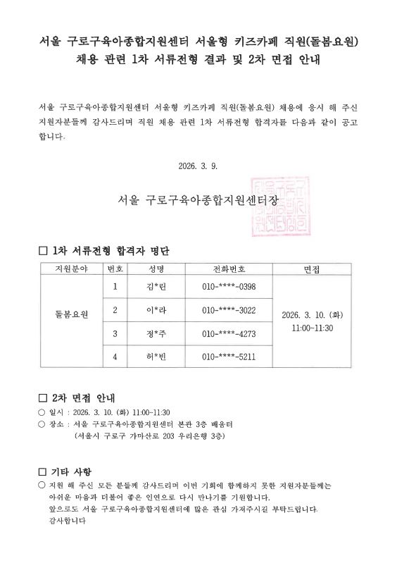 [GUROSCC-채용] 서울 구로구육아종합지원센터 서울형 키즈카페 직원 (돌봄요원) 채용 관련 1차 서류전형 결과 및 2차 면접 안내