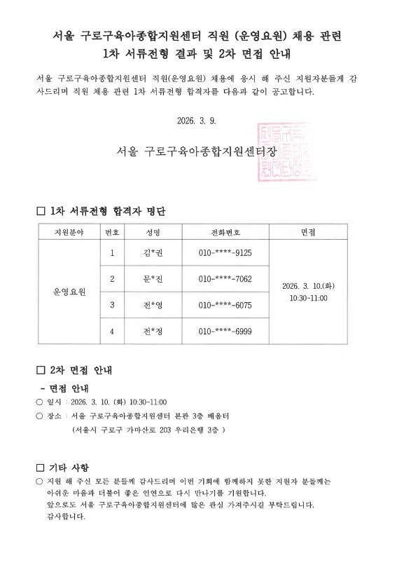 [GUROSCC- 채용] 서울 구로구육아종합지원센터 직원(운영요원) 채용 관련 1차 서류 전형 결과 및 2차 면접 안내