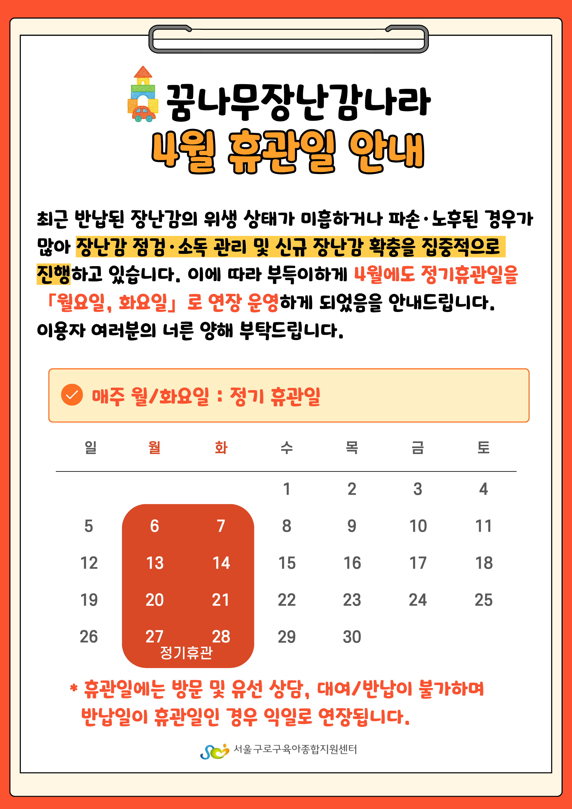 [GUROSCC-안내] 꿈나무장난감나라(구로점/오류점) 4월 휴관일 안내