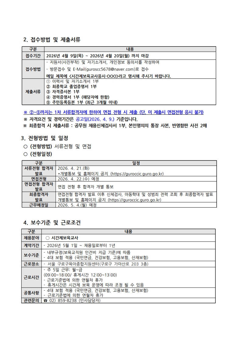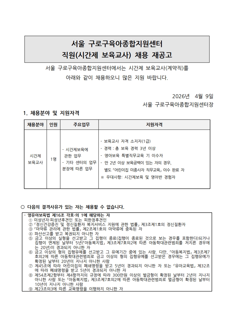 붙임1. 서울구로구육아종합지원센터 직원(시간제보육교사) 채용 재공고문(26.4.9).pdf