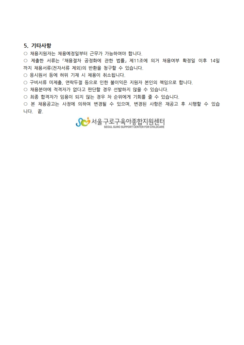 [GUROSCC-채용] 서울 구로구육아종합지원센터 직원 (시간제보육교사) 채용 4차 재공고
