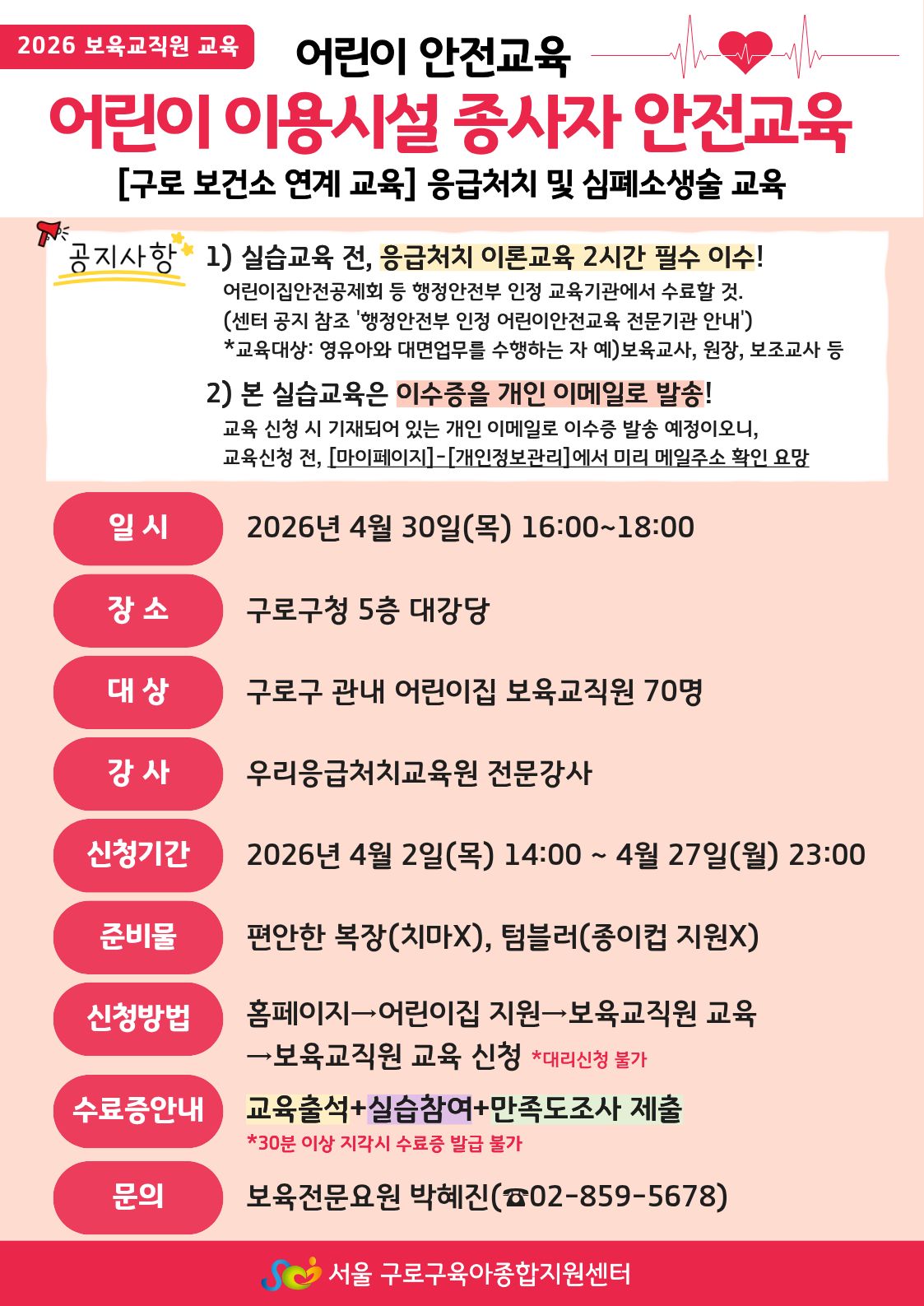 ② 실습 교육 전, 응급처치 이론교육 2시간을 필수로 이수하셔야 합니다. 자세한 내용은 안내문을 참고해주세요.