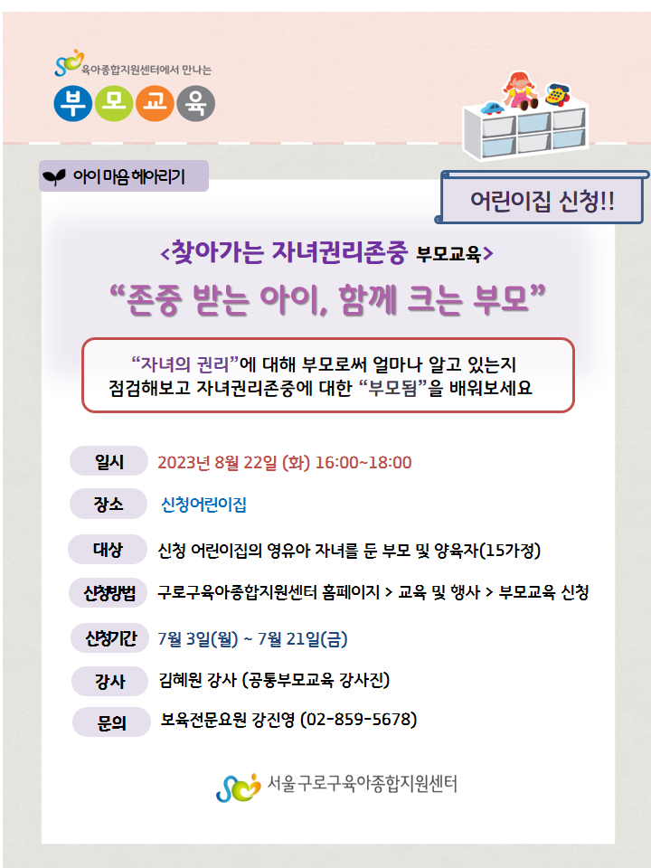 8월 찾아가는 자녀권리존중 부모교육 ' 존중받는 아이 함께 크는 부모'