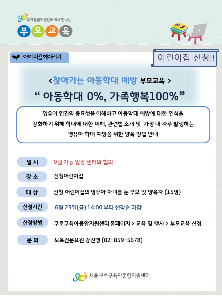 (어린이집 신청) 9월 찾아가는 아동학대예방 부모교육 '아동학대 0% 가족행복100%'