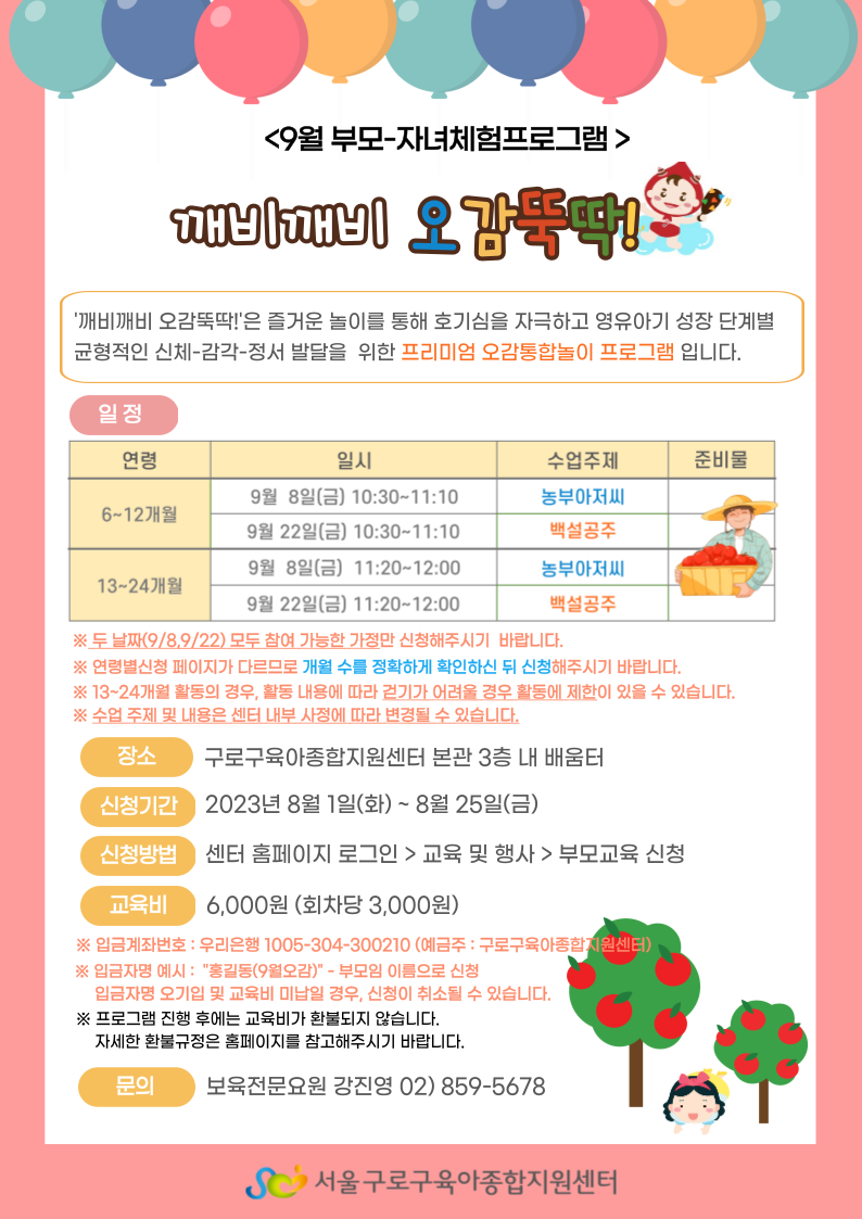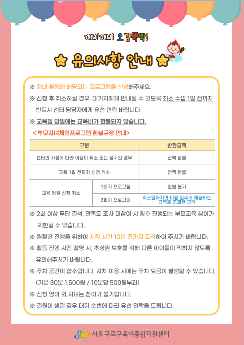 ★ 본 교육은 부모-자녀 체험프로그램으로 자녀 1명당 보호자 1명이 꼭 함께 참여해주셔야 합니다. ★ 각 회기당 연속성이 있는 체험 활동으로 "1회기(9/8 11:20~12:00) 와 2회기(9/22 11:20~12:00)" 모두 참석하실 수 있는 가정만 신청 부탁드립니다. ★ 회기당 교육비(재료비 포함)는 3,000원으로 입금 시, 2회기 분(6,000원)을 한번에 입금해주시면 됩니다.(교육비는 교육일 3일 전까지 납부되지 않을 경우 다음 대기자에게 순번이 넘어갈 수 있습니다.) ★ 깨비깨비오감뚝딱에 대한 부모님의 수요와 관심도가 높아 교육인원이 7명으로 증원되었음을 알려드립니다. ★ 9월부터는 강사님이 변경되어 새로운 강사님께서 함께 하실 예정입니다. ★ |