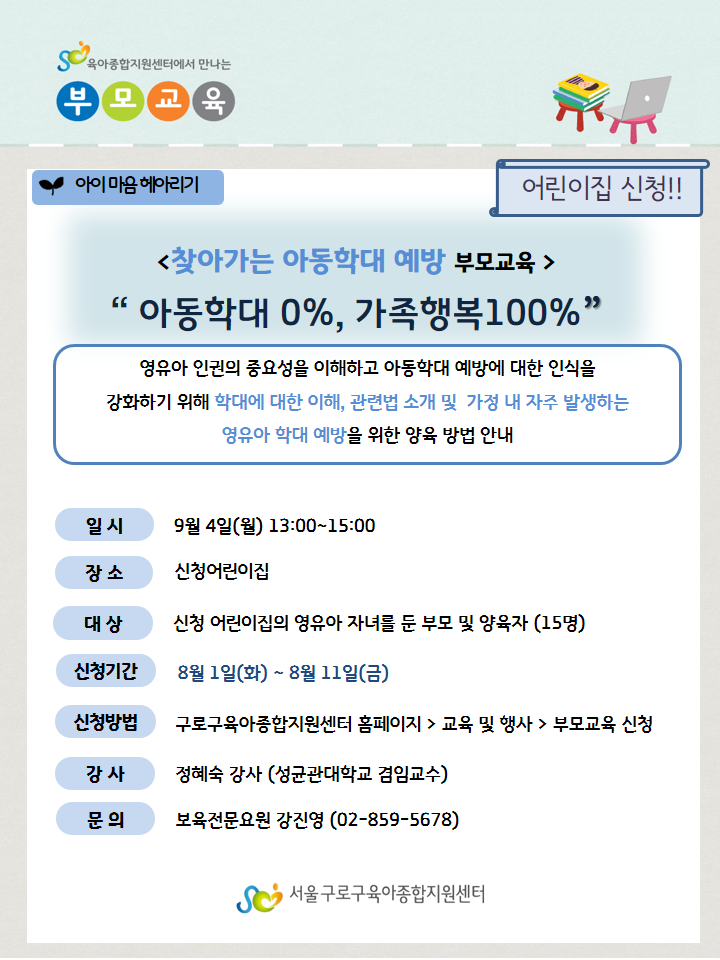 | 9월 찾아가는 아동학대 예방 부모교육 ' 아동학대 0%, 가족행복100%' |