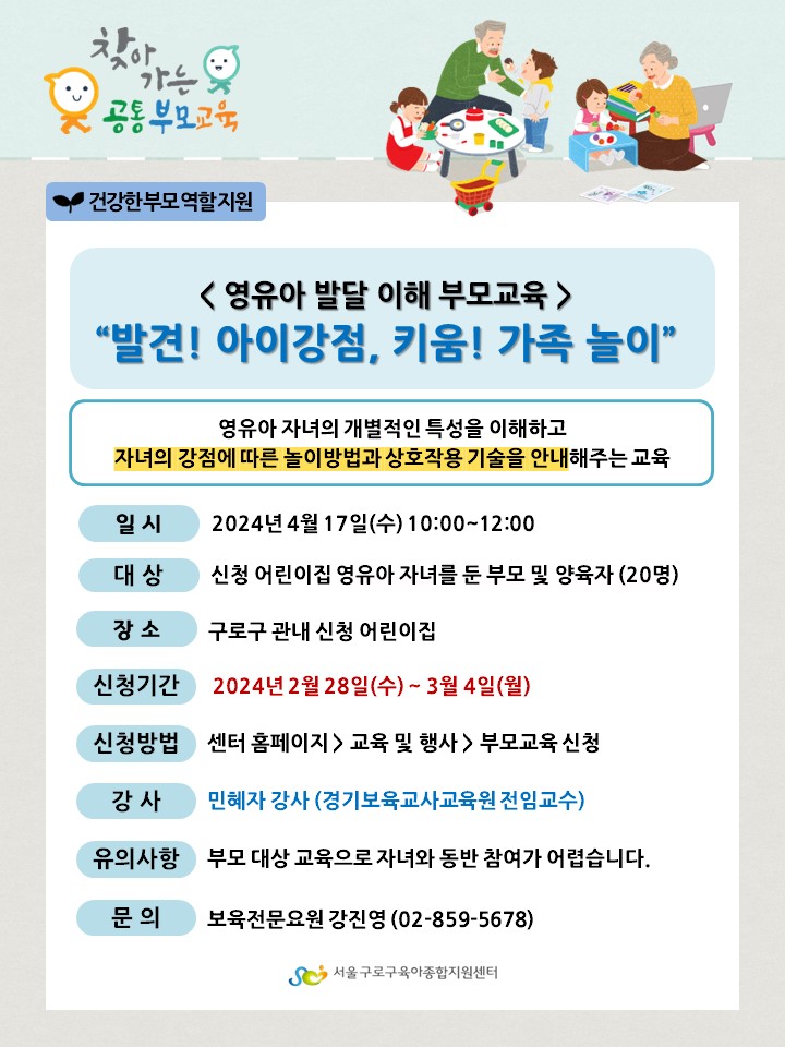 | ★어린이집 신청★ [찾아가는 영유아발달이해 부모교육] 발견! 아이강점, 키움! 가족놀이 |
