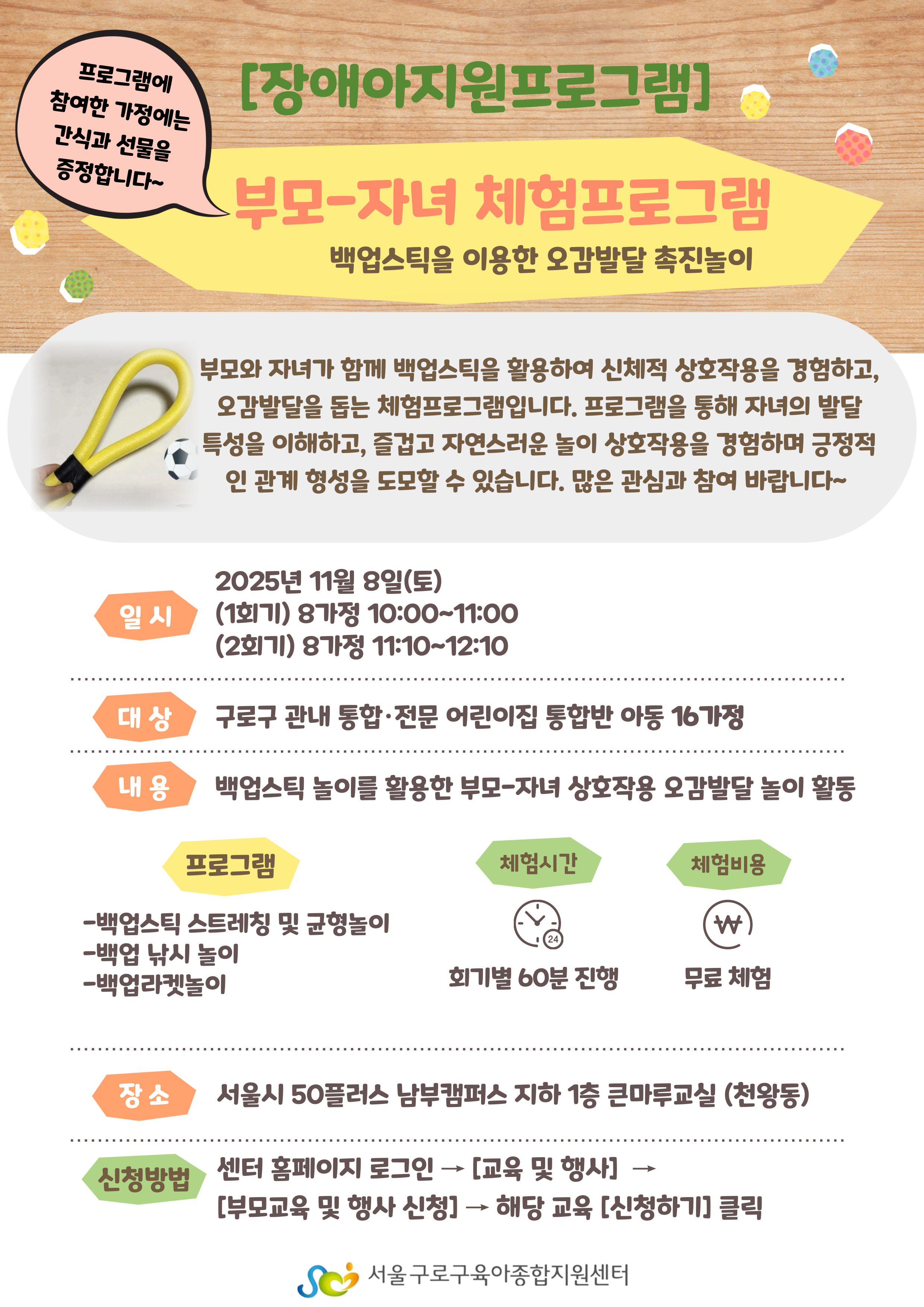 | [장애아지원프로그램] (2회차) 가족 및 부모 체험 프로그램 '백업스틱을 이용한 오감발달 촉진놀이' |