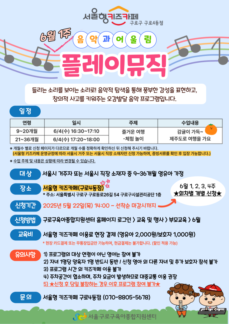 1) 프로그램 대상 연령이 아닌 영아는 참여 불가합니다. 2)자녀 1명당 양육자 1명 반드시 동반/ 신청 영아 외 다른 자녀 및 추가 보호자 참석 불가합니다. 3) 프로그램 시간 외 키즈카페 이용 불가합니다. 4) 주차공간이 협소하며, 주차요금이 발생하므로 대중교통 이용 권장드립니다. 5) 신청 후 당일 불참 하는 경우 이후 프로그램 참여 불가합니다. |