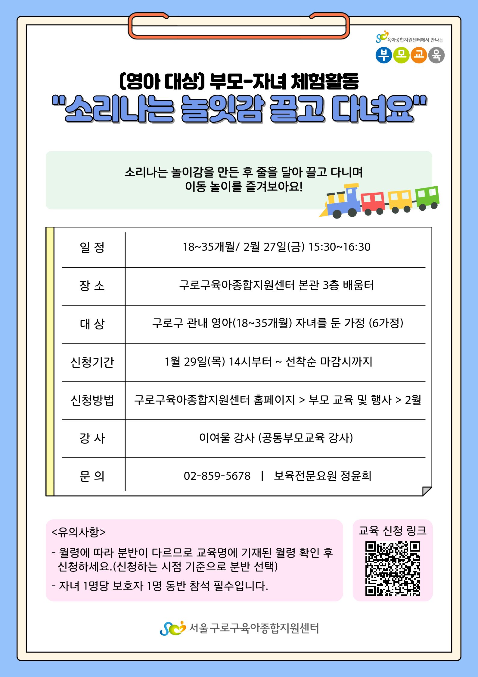 | [2월 부모-자녀 체험활동] 소리나는 놀잇감 끌고 다녀요(영아대상/18~35개월) |