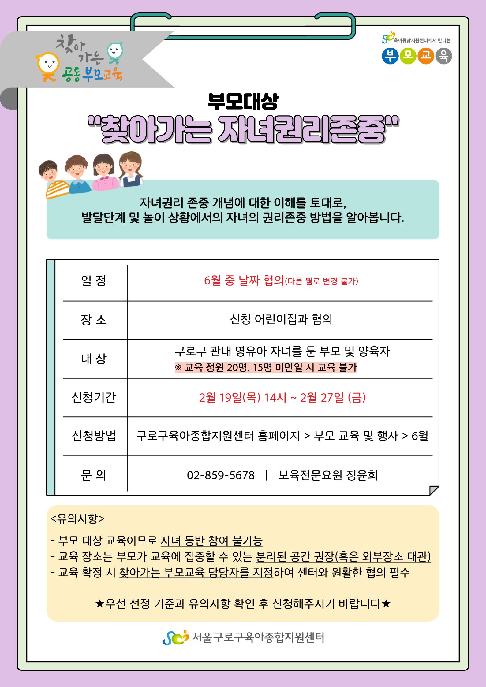 [유의 사항] - 해당 부모교육은 부모 대상 교육으로 자녀 동반 불가능 - 교육 장소는 부모가 교육에 집중할 수 있는 분리된 공간 권장(혹은 외부장소 대관) - 찾아가는 부모교육 담당자를 지정하여 센터와 원활한 협의 필수 - 교육 일주일 전 교육 장소, 환경, 준비할 것(기자재 및 간식) 협의 - 교육 3일 전까지 교육 명단 이메일로 회신 - 사전에 부모님께 ‘질의응답 시간에는 영유아 자녀에 대한 질문만 받을예정’임을 안내 |